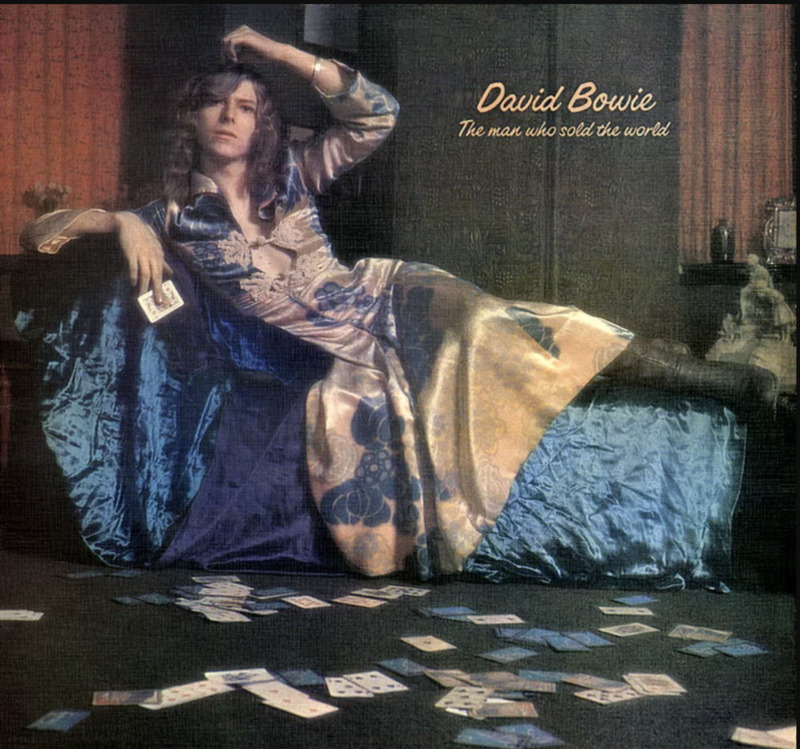 UK album cover for The Man Who Sold the World album by David Bowie. Bowie is reclined on a chaise longue in a cream and blue satin "man's dress" designer by Mr. Fish.