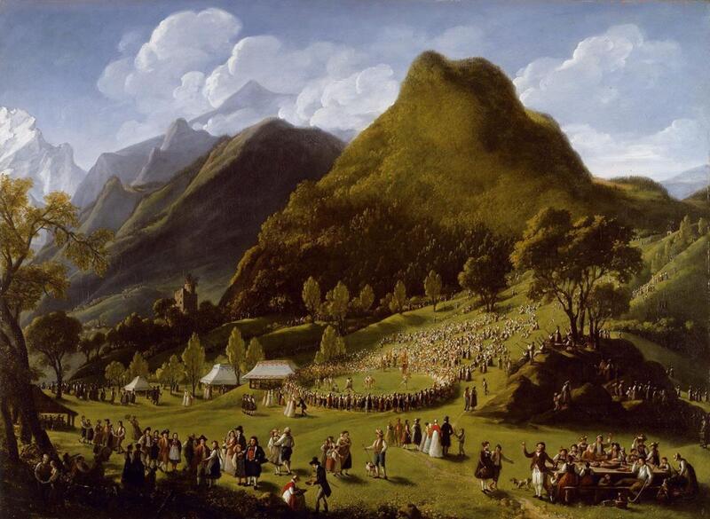 Festival; Switzerland; 1800s; 19th century; shepards; landscape; Swiss; folklore; dancing; customs