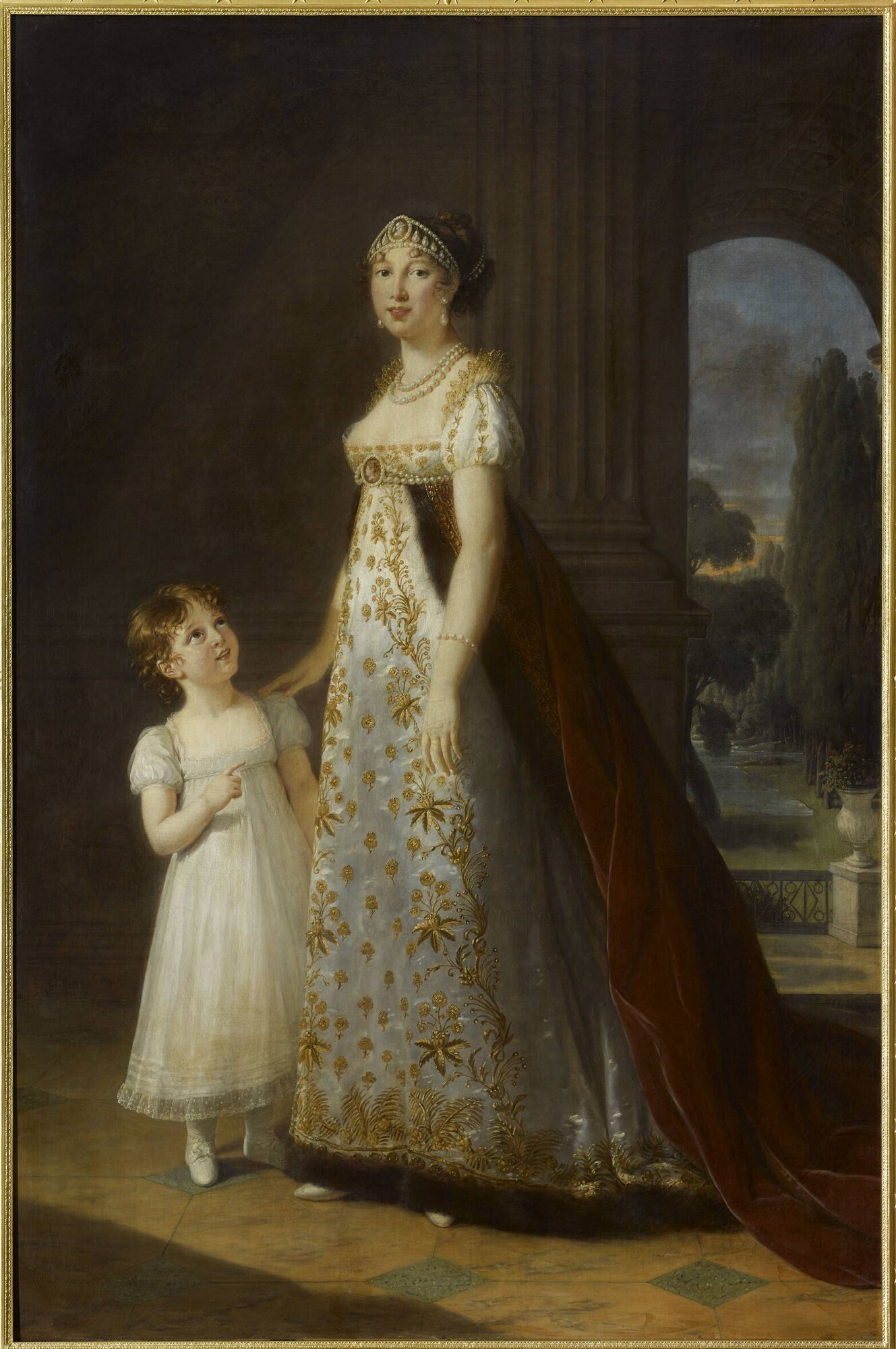 The princess Caroline Murat is depicted as the Grand Dutchess with the titles of Cleves and Berg after her husband campaign in Germany. Caroline is depicted next her her daughter Laetitia. The contrasting gesture Caroline makes to her daughter is gentle and caring for her daughter. Laetitia looks up to her mother in admiration. Caroline is dressed in a white satin dress with gold embroidery as well as a velvet robe. The attire represented shows her relationship with the Empire and the luxuries of the crown. Her daughter is wearing a white dress to match her mother, the two gaze upon with a smile illuminating a gentle atmosphere.