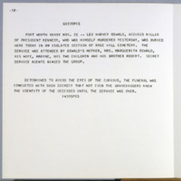Flash-November 22, 1963: Text, Pages 17-18 This 1968 portfolio used Teletype texts reporting the assassination of President John F. Kennedy. By screenprinting the Teletype texts, Warhol could relay the unfolding situation. However, Warhol used the news story and created the screen prints more than four years after it first shocked the nation. He did this in particular to speak on the media and public's obsession with tragedy and portraying all news events as horrible. This is not to say that the assassination wasn't horrible, but rather was Warhol's manner of underlining how no one could escape feeling sad due to how the television and radio programmed the public. -