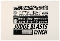 New York Post (Judge Blasts Lynch) This piece represents one of Warhol's many screen prints. In this one he intentionally used an article that headlined “Judge Blasts ‘Lynch Mob,’” that recounted the sentencing of the first among a group of white teenagers who beat a black transit worker to death in 1982. Warhol however cropped the word “mob,” leaving only "Judge Blasts 'Lynch," forcing the viewer to puzzle out the meaning. Warhol also decided to eliminate the image that accompanied the “Act of Humility” caption at the bottom left of the original newspaper, which showed Pope John Paul II washing the feet of a homeless boy in Rome. This further emphasized the picture of the boy arrested and the headline about the act that occurred. -