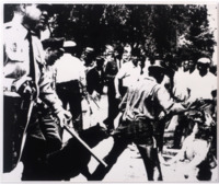 Birmingham Race Riot This screen print of an image of the Birmingham Race Riots is similar to other Warhol prints of current news reports. The Birmingham Race Riots were a protest against segregation that was met with violent police action. The Race Riots of the 60s were a key part of the US Civil Rights Movement. By printing an image of the event Warhol highlights the issues people face on the daily. As well, he provides purely the image of the riot not a biased news report as a newspaper would, allowing the viewer to truly sit with the violence in the image. -