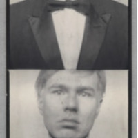In two photobooth style pictures, one on top of the other and connected, is depicted a 36 year old Warhol alone. He is wearing a tuxedo and bow tie with his hair combed to his right side. In both pictures he has a serious look on his face with his head slightly tilted to his left in the bottom picture. The photobooth picture is in black and white.