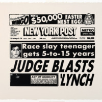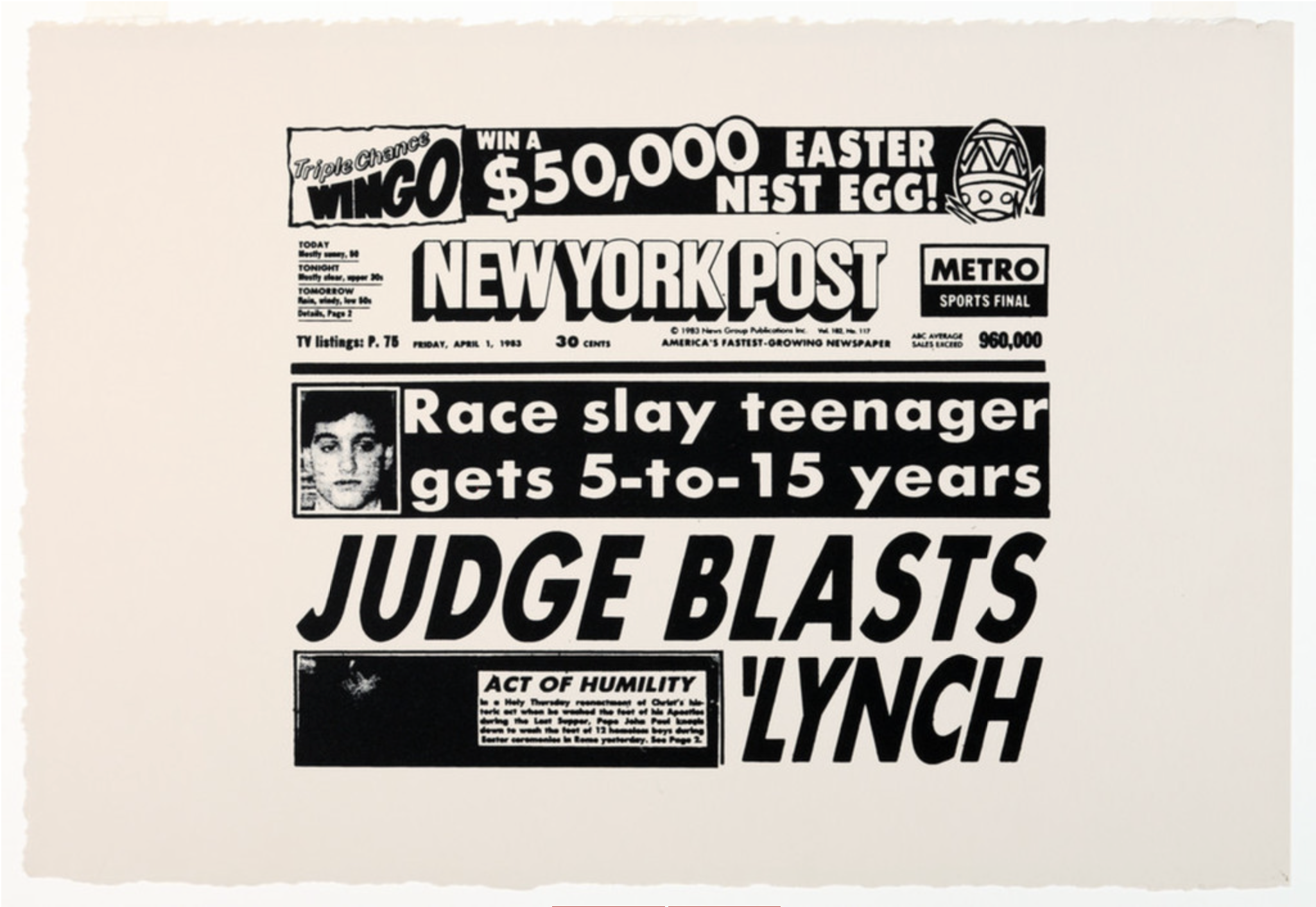 This piece represents one of Warhol's many screen prints. In this one he intentionally used an article that headlined “Judge Blasts ‘Lynch Mob,’” that recounted the sentencing of the first among a group of white teenagers who beat a black transit worker to death in 1982. Warhol however cropped the word “mob,” leaving only "Judge Blasts 'Lynch," forcing the viewer to puzzle out the meaning. Warhol also decided to eliminate the image that accompanied the “Act of Humility” caption at the bottom left of the original newspaper, which showed Pope John Paul II washing the feet of a homeless boy in Rome. This further emphasized the picture of the boy arrested and the headline about the act that occurred.