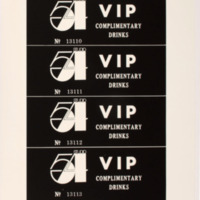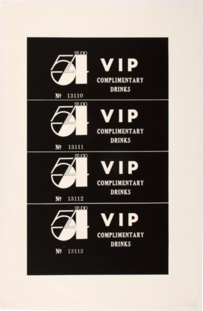 This print contains 4 differently numbered complimentary drink invitations to Studio 54. Studio 54 is located in Midtown Manhattan, and was a nightclub infamous for its celebrity guest lists, quixotic entry policies, extravagant events, rampant drug use, and sexual hedonism. Warhol was one of the frequent guests to this club, and made many artist and popular celebrity connections, like Carolina Herrera mentioned before. The four invitations in the screen print, look as if they can be ripped or separated to use them alone. As well, the invitation allows for a VIP pass into the studio alongside the complimentary drinks.