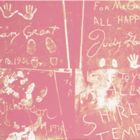 This screen print of a sidewalk has a salmon pinkish color to it making the engravings and imprints in the sidewalk more visible. This particular sidewalk has the hand prints, foot prints, and engravings of Judy Garland, Shirley Temple, Jack Nicholson, and Cary Grant. These stars ranged from the 50s to the 70s. As well, the print looks as if it were two sidewalks in separate locations that Warhol decided to put side by side for the print. This brings up the question of why these four stars in particular? Besides that this print builds on the slow interconnectedness between art and pop culture that occurred during the Pop Art movement.