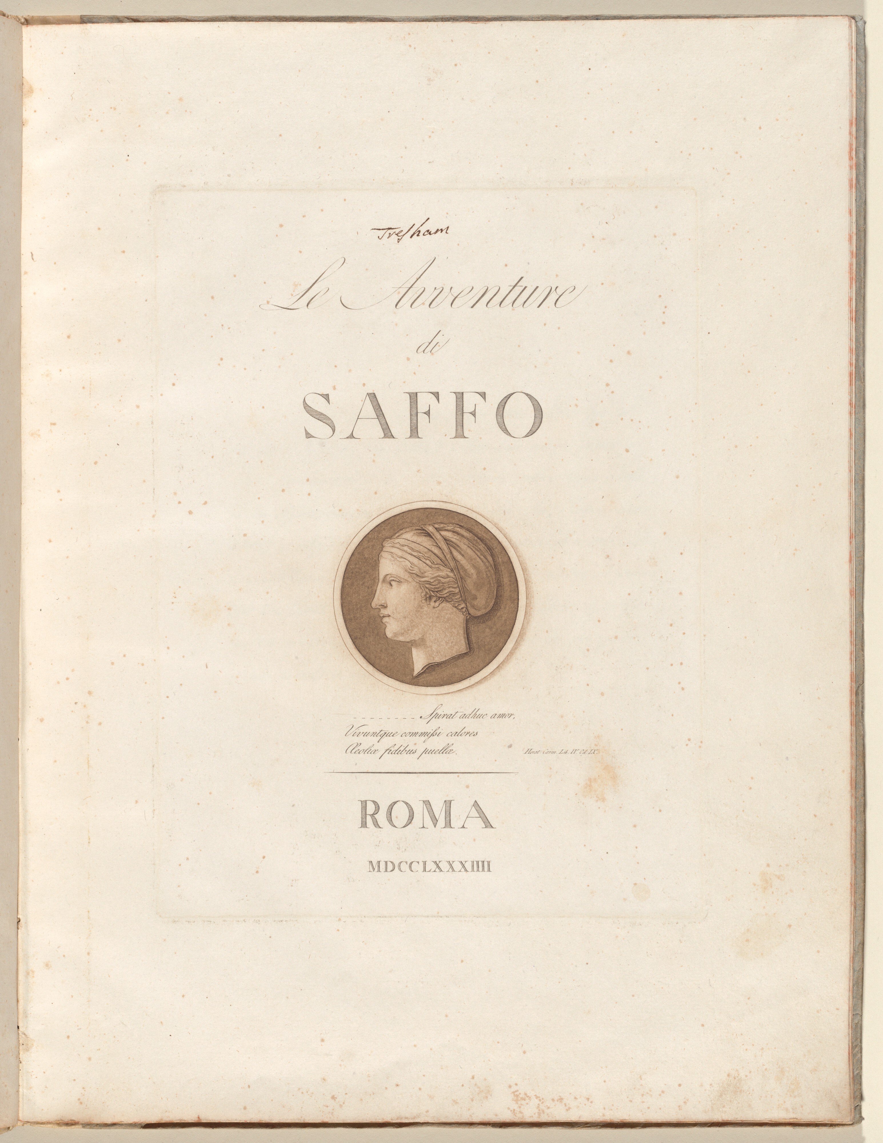 An aquatint title page in brown ink with etchings and engravings. The page itself is slightly brown and sparsely spotted from aging and other unknown forms of tarnishing, but these are all light. The center of the page contains a faint rectangular outline with the title, writing, and illustration within it. John Tresham’s signature is small, above the title “Le Avventure di SAFFO” in large lettering. Below the title is a circular portrait of Sappho that just contains her head and neck. Below this is small cursive writing in Italian with a line drawn underneath it. Below the line is “ROMA” in medium sized print, then “MDCCLXXXIIII” in small print.