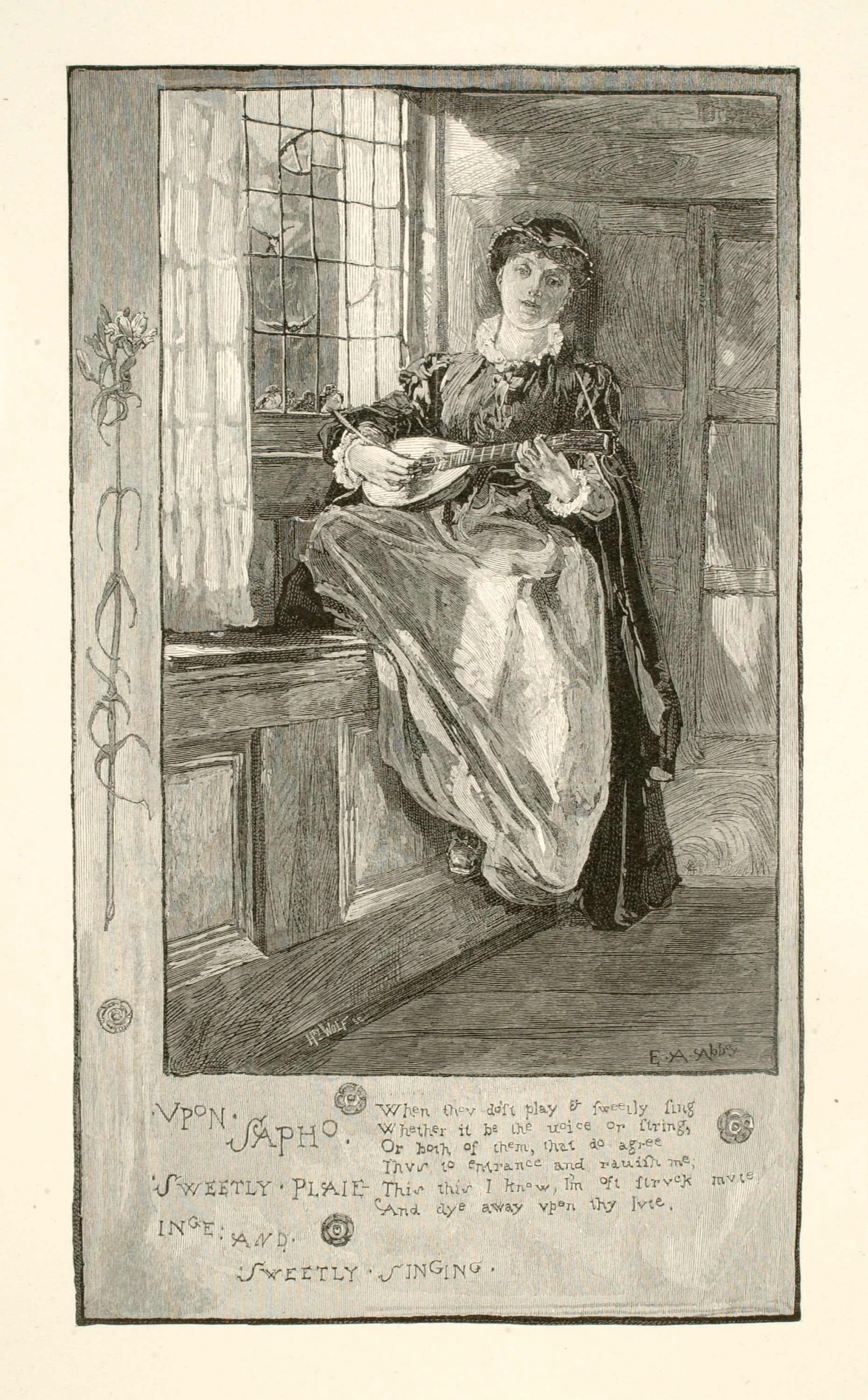 An illustration of Sappho sitting casually in a windowsill with a lute. She is wearing clothing not indicative of her true time period. She wears a dress that appears European and most relevant to the 18th or 19th centuries, with a cape, skirt, frilly neck-hugging collar, and a hat covering her hair that is seemingly pulled up and back. She sits inside of a house in some corner of a room. The borders around the illustration on this page have aesthetic designs filling up empty spaces. Below the art is old English writing. On the left, it describes the scene “Upon Sapho / Sweetly plaie- / inge and / sweetly singing.” with a poem written in smaller print to its right.
