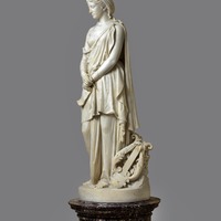 A marble sculpture of Sappho. She is depicted head-to-toe. Her hands are clasped in front of her, a paper in one hand and a writing utensil in the other. Her right knee slightly bent. To the left of her, resting next to her calf, is a lyre with intricate swirling details. She wears a robe that drapes over her left shoulder, the other slouched around her right arm near the elbow, leaving her right breast uncovered. The robe extends to the floor, covering her ankles, with part of her feet visible. She looks slightly down, appearing to be very thoughtful. Her hair is wrapped from the crown to the bottom of her head in a bandana-like cut piece of fabric that keeps her hair pulled back with only some loose strands on her back and shoulders.