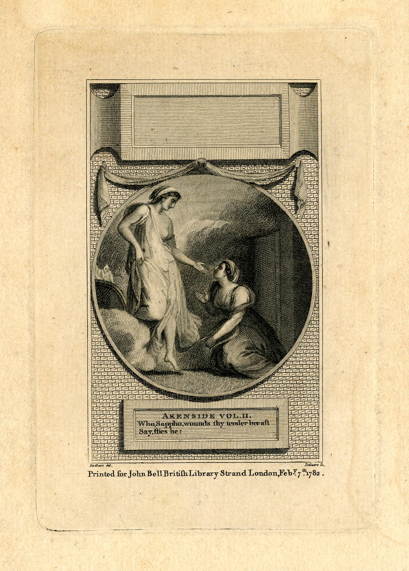 A woman steps toward Sappho, emerging from the left of the illustration, seemingly coming out of a cloud. She extends her left arm down toward Sappho, who kneels and looks up at her. Sappho holds a lyre down toward the floor in her lap with her left arm while her right hand slightly reaches toward the direction of the woman. The woman wears a robe-like dress with her left breast uncovered and her left leg emerging from the fabric. Sappho is in a dress with only portions of her arms and neck uncovered. This is contained in a circular frame with filler decorations, text, drawn fabric, and structures surrounding the frame.