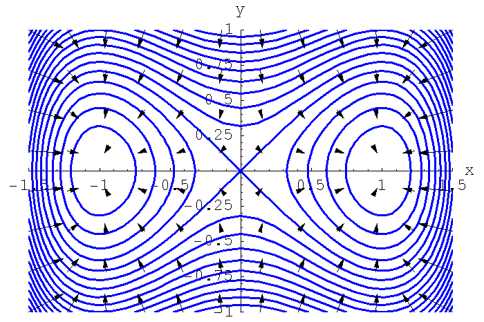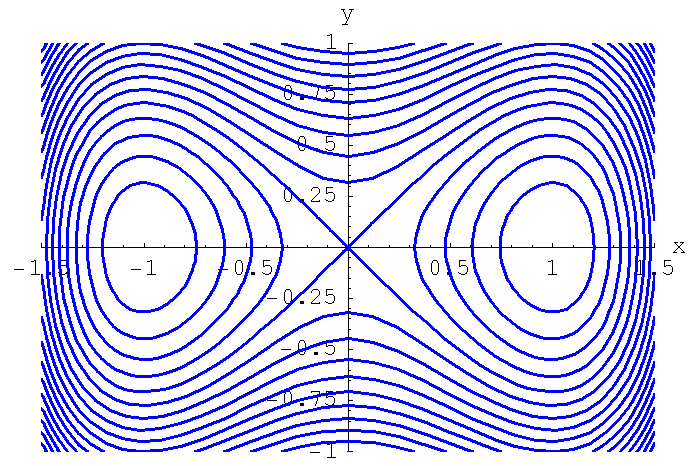 \(f(x, y) = \frac 1 2 x^2 - \frac 1 4 x^4 - \frac 1 2 y^2\).