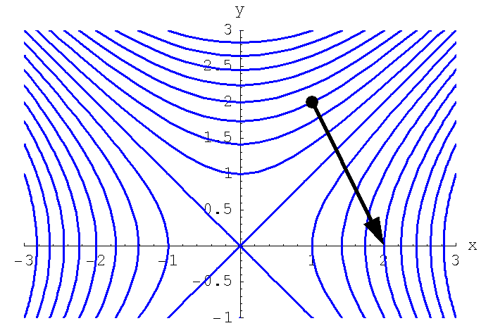 The gradient of \(f\) at the point \( (x,y) \) is the vector \(\nabla f(x, y) = \langle x, -y \rangle\).